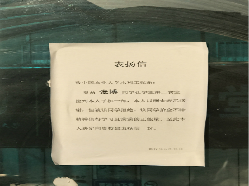 近日,在第三公寓食堂的门口张贴着一封感谢信,信中感谢永利官网水利151班张博同学拾金不昧的举动,记者随即采访了解事情的经过。 原来在5月12日,张博在第三食堂吃饭时意外发现一部被遗失的手机,在等待长时间不见失主的联系后,张博主动联系了失主的亲人,才得以尽快将手机归还。据悉,失主是农大正在修建的图书馆的工程监理,在中午吃饭时不慎将手机忘在餐桌上。在归还手机时失主曾表示要给予酬金感谢,但被张博拒绝。最后失主只好将表扬信悄悄粘贴在男生公寓楼下。 “我只是做了很普通的事”,张博在记者表达出要采访的意图时这样说道,“希望可以更多关注事件本身,而不是我个人。”在谈及当时的想法时,张博只是笑着摇头说:“当时没什么想法,将心比心,如果自己丢失了手机肯定也会很焦虑。看着消息灯不停在闪烁,只想尽快把手机还给失主。每个农大的学生遇到这种事都会像我这样做,我只是尽了应尽的义务。”据了解,张博每个月的生活费用并不宽裕,他却表示较少生活费用并不能成为一个人放弃拾金不昧这种传统道德的理由,“而且学校每学期都会提供贫困资助,自己也在课余时间勤工俭学,这些足够支撑自己的大学生活。” 这就是张博,在困难面前坚毅乐观,在生活面前充满希望,在任何时候能坚守自己赤子之心,也希望拾金不昧的正能量在农大校园里发扬光大。