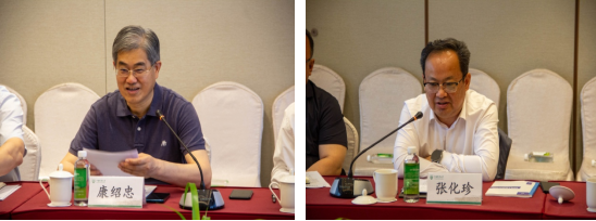 实验室主任康绍忠院士致欢迎辞,他首先对内蒙古自治区农牧厅领导一行的到来表示热烈欢迎。强调了在习近平总书记“3–14”关于水安全重要讲话十周年、《节约用水条例》颁布施行之际,自治区农牧厅以解决“大定额灌溉”、“浇白地”问题为重点,前来重点实验室当面共同交流内蒙古农业节水工作,是双方深入贯彻总书记有关治水系列讲话精神、推动实验室科技成果落地并助力内蒙古农业用水向节约集约转变的良好契机,希望双方在科研攻关和社会服务等方面把握机遇、加强合作,助推自治区农业水利高质量发展。 自治区农牧厅副厅长张化珍介绍了内蒙古农业生产与农业节水情况,表达了在发展农业高效节水技术、破解大定额灌溉问题、突破旱作农业发展瓶颈、引领智慧灌溉技术发展等方面加强与重点实验室深化合作的愿望,并诚挚邀请以康绍忠院士为首的重点实验室团队到内蒙古开展学术研究和工作指导,期待团队师生尽早将农业节水科研成果与先进技术在内蒙古落地生根、开花结果。